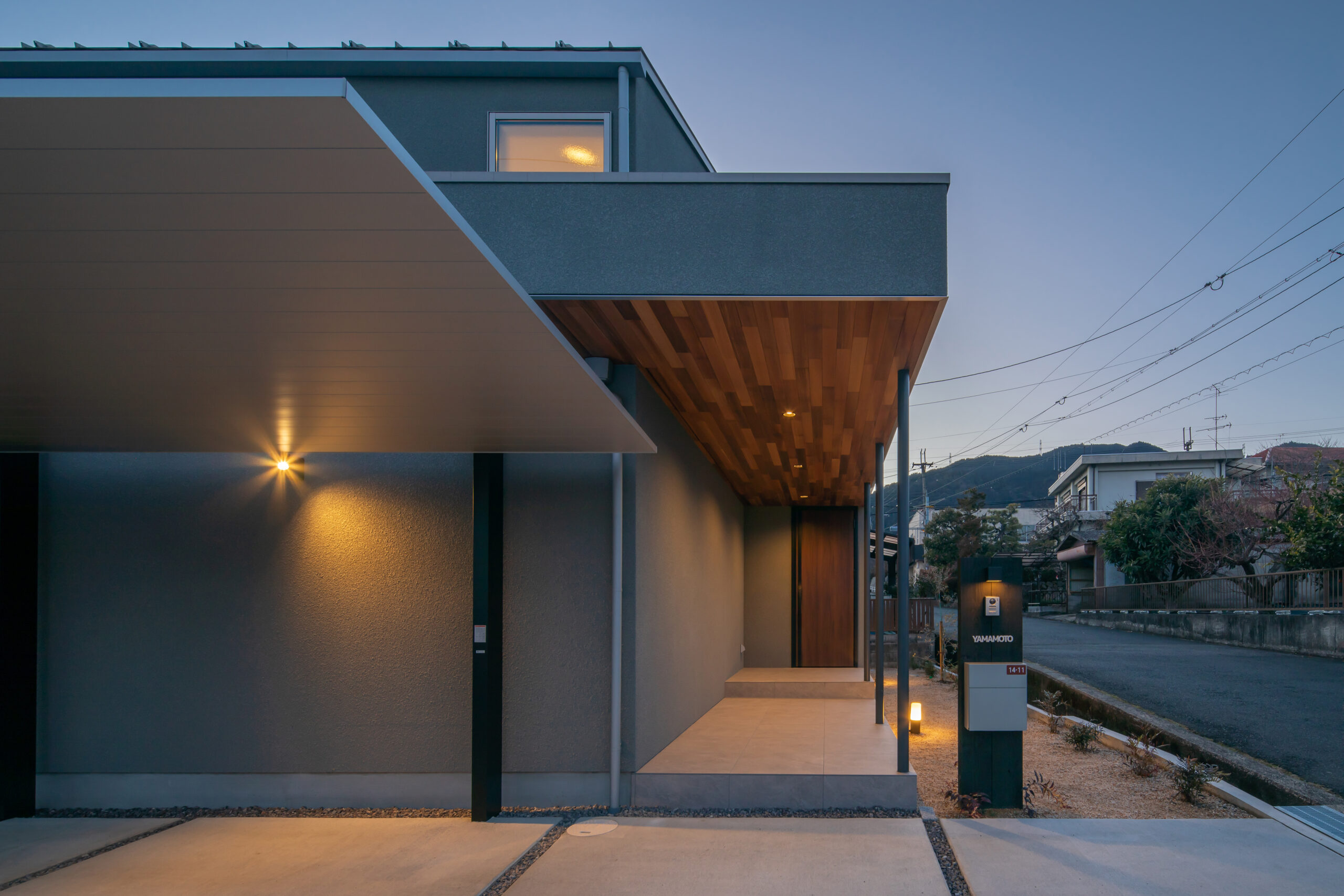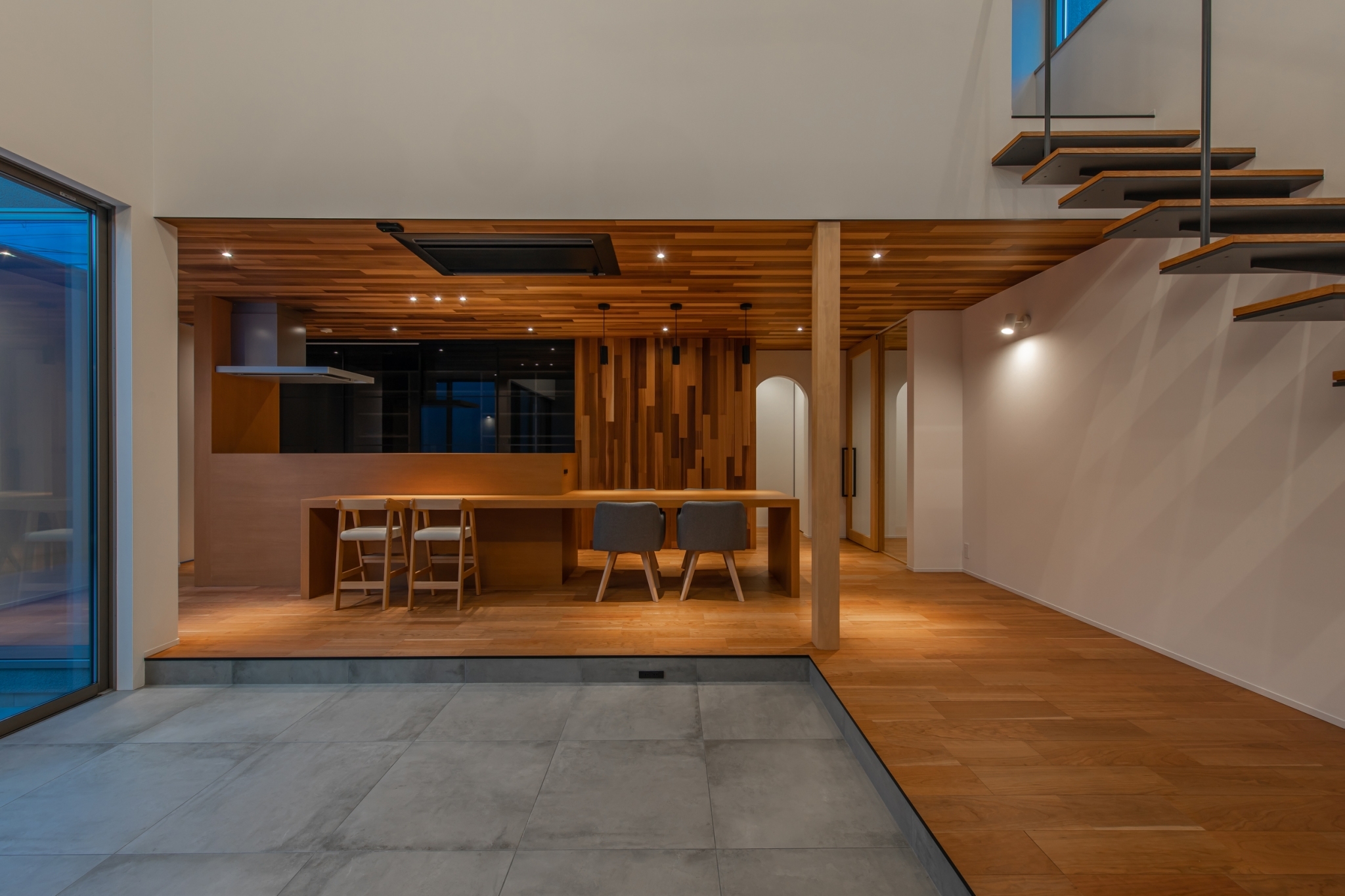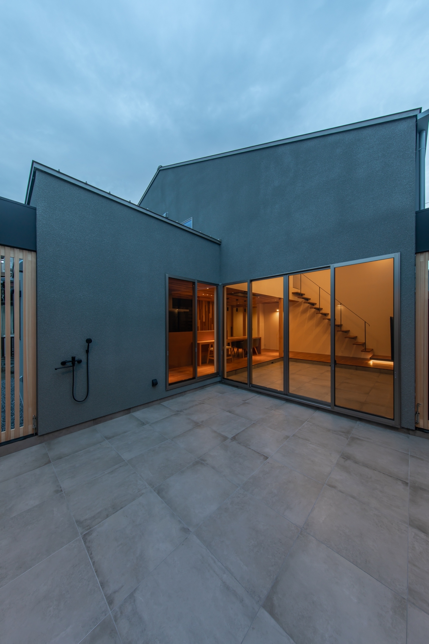 落ち着いたグレーの外壁に包まれた、静かで上質な佇まい。外からの視線をやわらかく遮りながら、内側には明るく開かれた中庭をもつ住まいです。深い軒と木の天井がつくる陰影が美しく、昼と夜で表情を変える外観デザイン。室内は、天井・床・壁に自然素材を調和させ、やさしい光が広がる落ち着いた空間に仕上げました。キッチンと一体になった造作テーブルは、家族が自然と集まる場所。会話や食事を通して、暮らしの時間をゆるやかにつないでくれます。シンプルでいて、どこかあたたかい。“心が休まる家”を目指した、光と素材の調和が息づく住まいです。