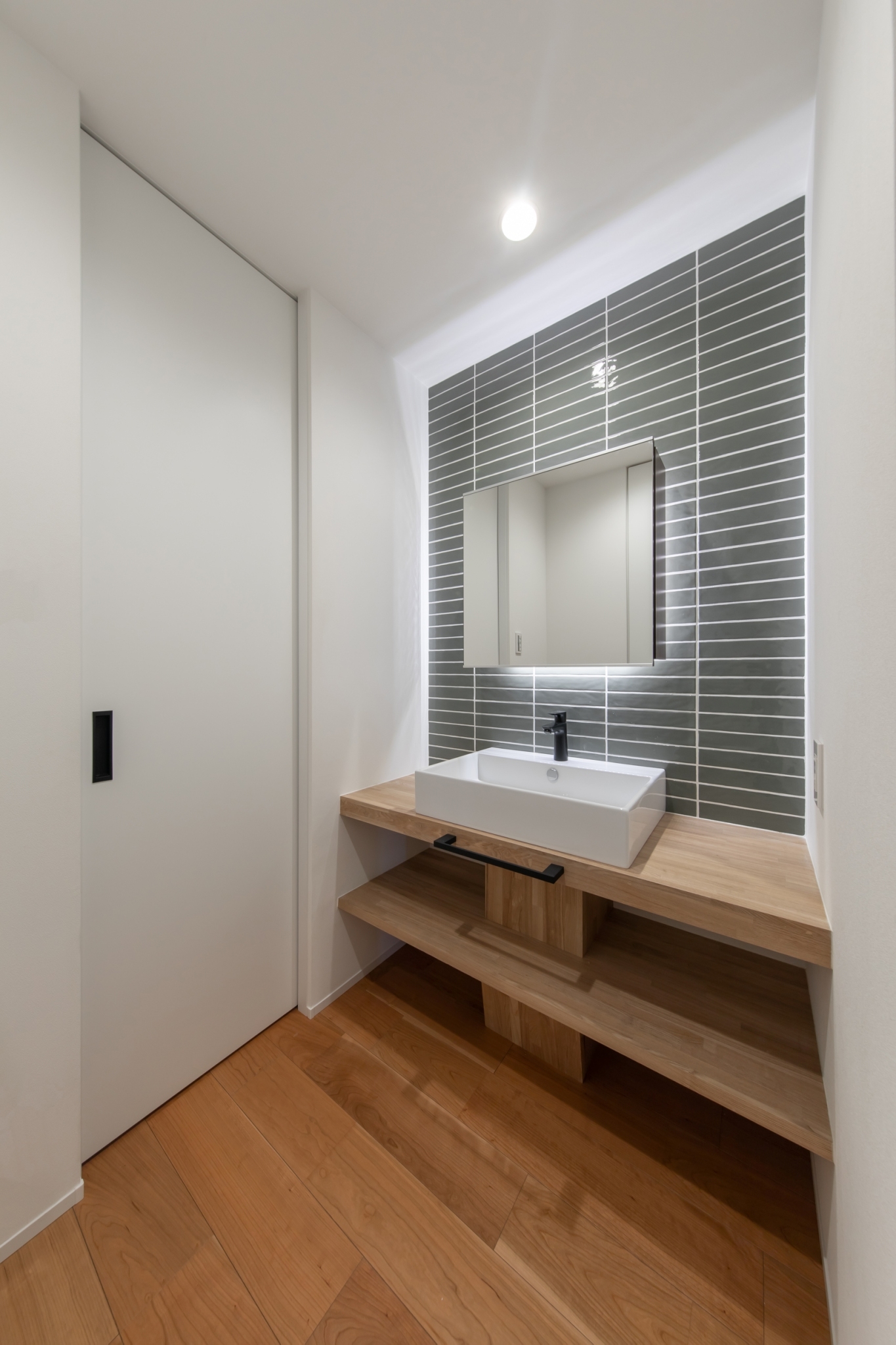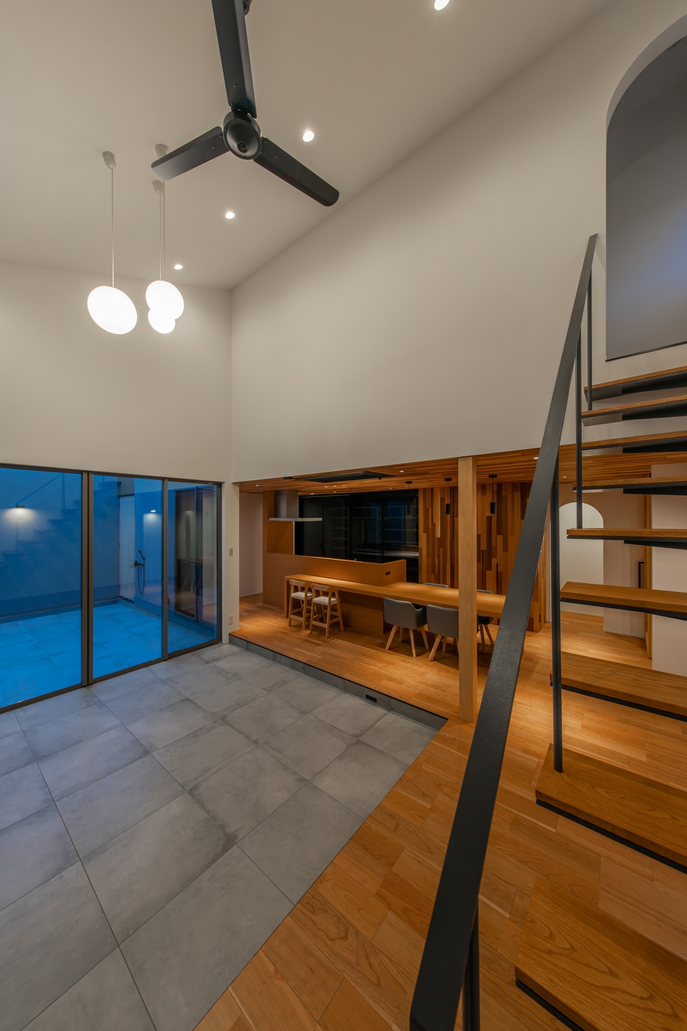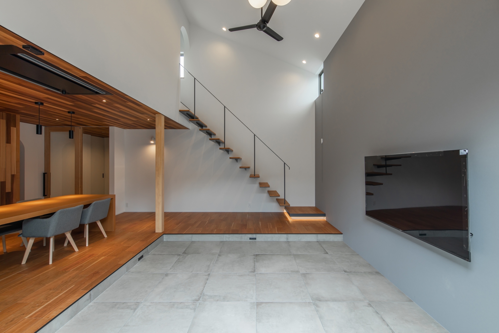 落ち着いたグレーの外壁に包まれた、静かで上質な佇まい。外からの視線をやわらかく遮りながら、内側には明るく開かれた中庭をもつ住まいです。深い軒と木の天井がつくる陰影が美しく、昼と夜で表情を変える外観デザイン。室内は、天井・床・壁に自然素材を調和させ、やさしい光が広がる落ち着いた空間に仕上げました。キッチンと一体になった造作テーブルは、家族が自然と集まる場所。会話や食事を通して、暮らしの時間をゆるやかにつないでくれます。シンプルでいて、どこかあたたかい。“心が休まる家”を目指した、光と素材の調和が息づく住まいです。