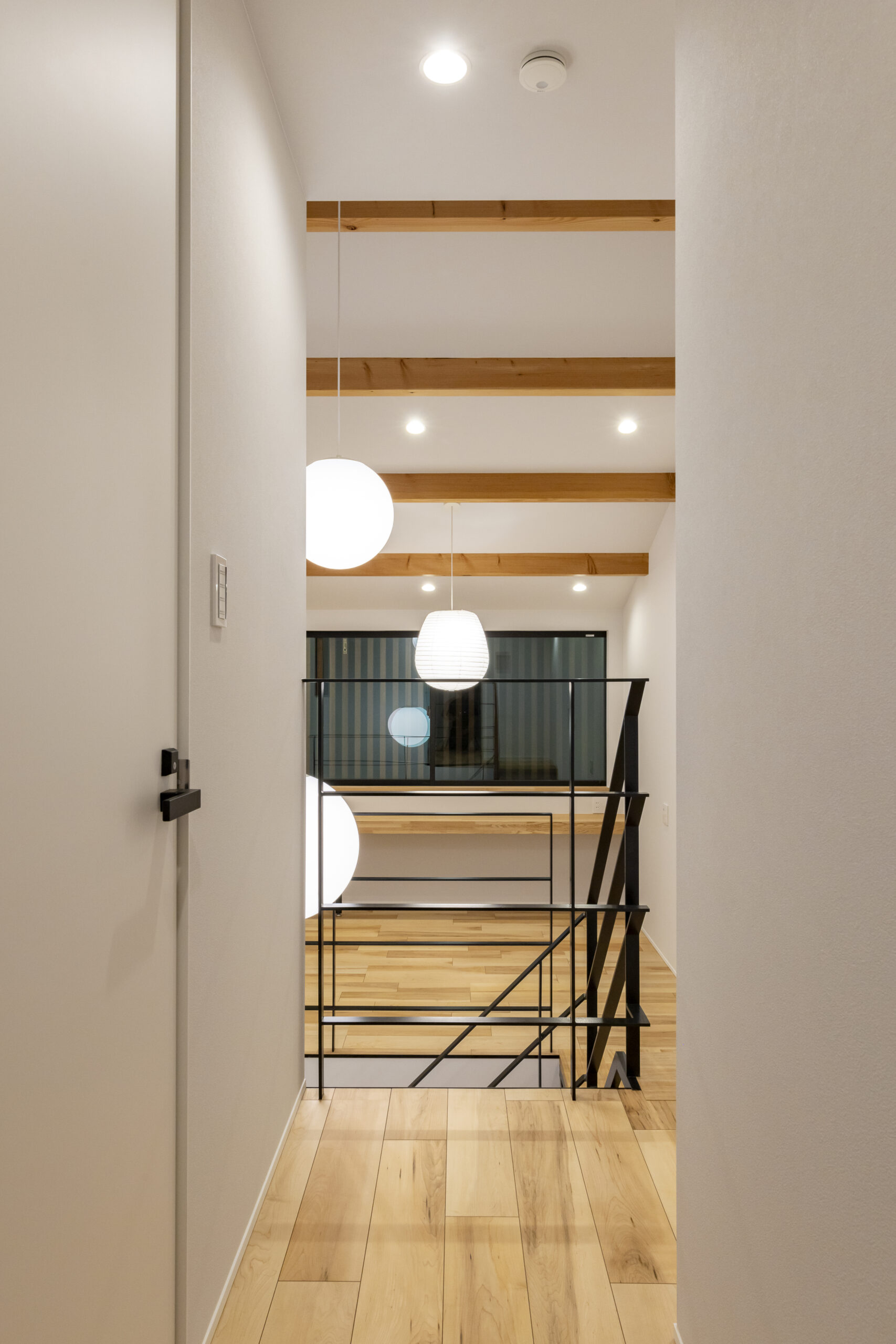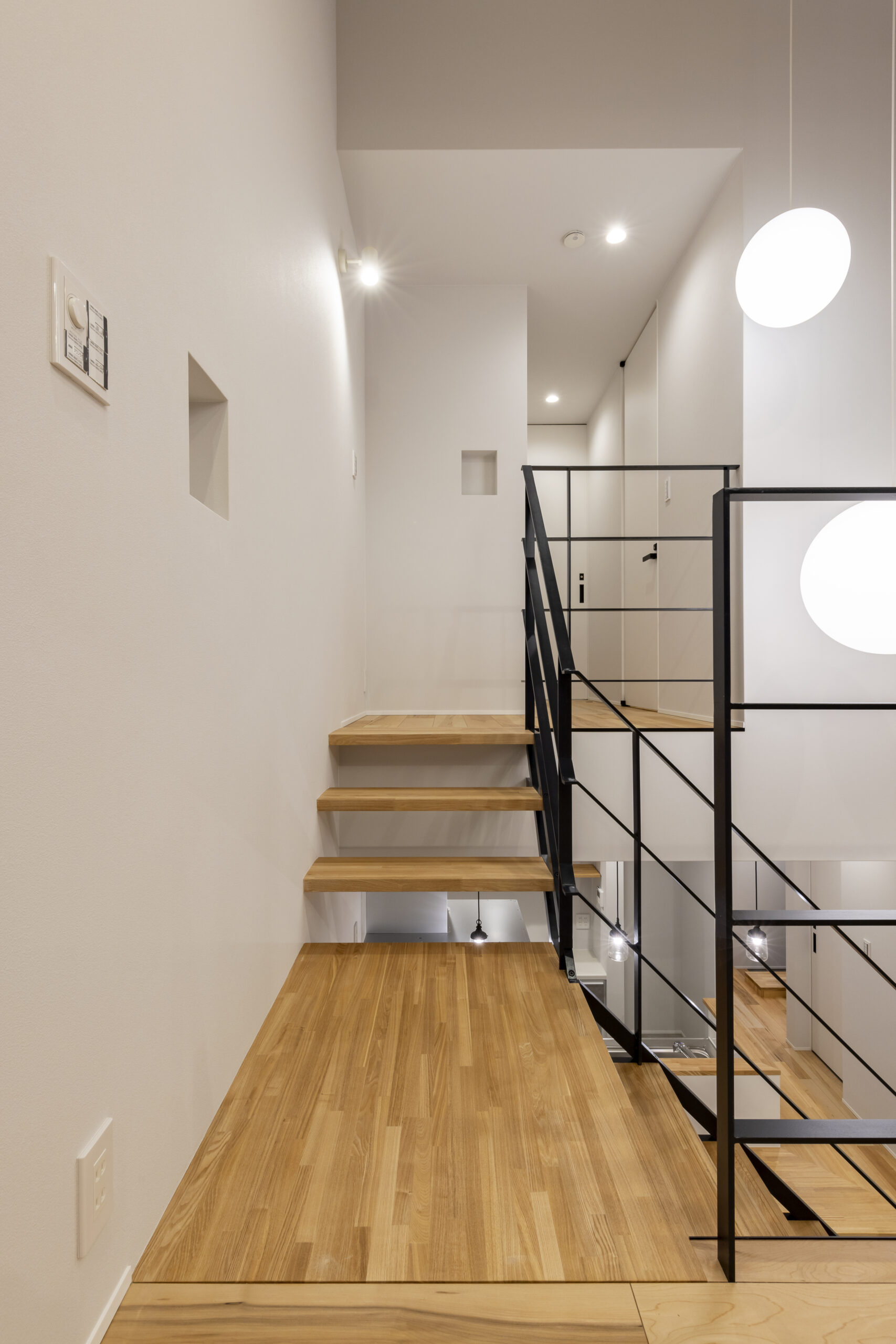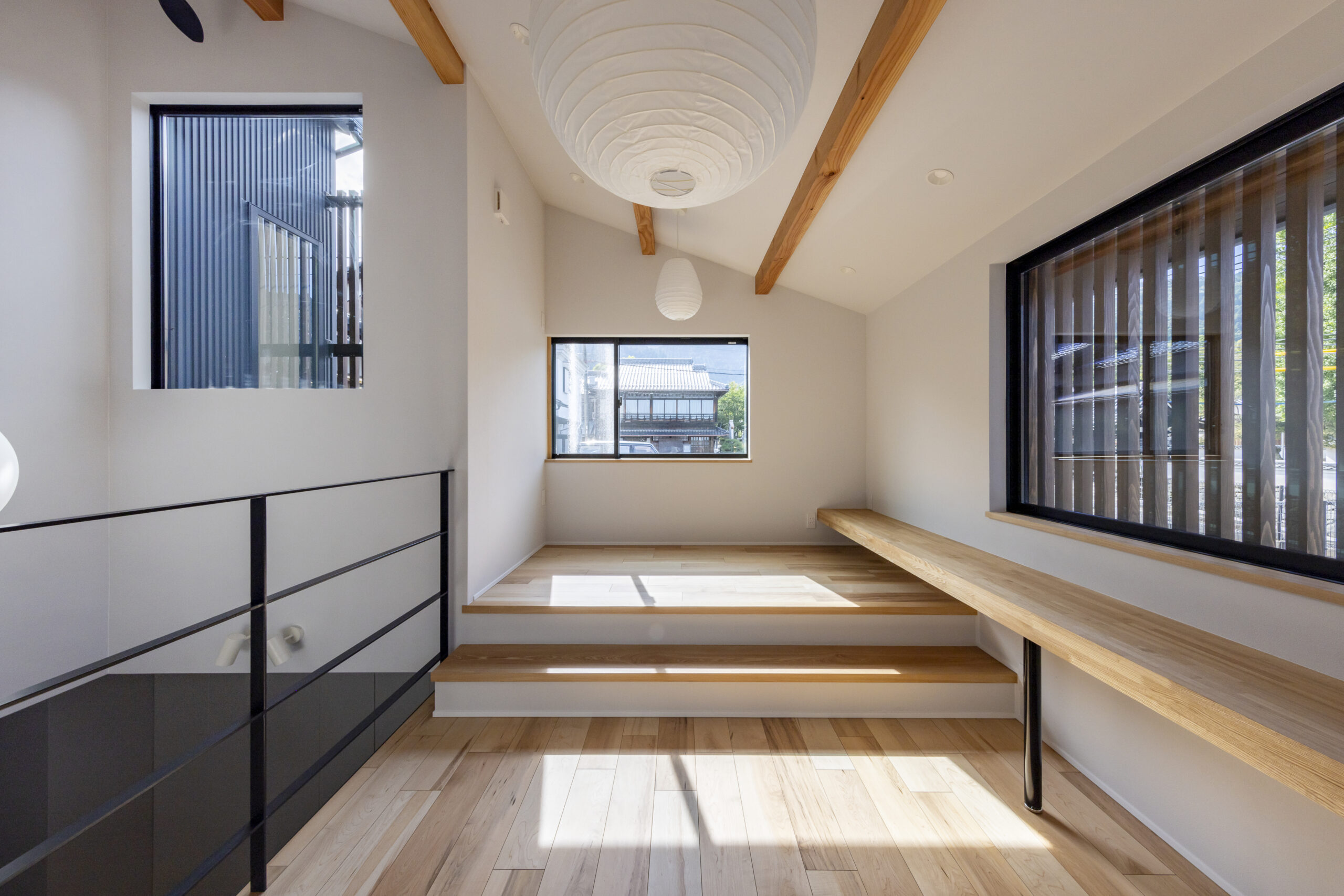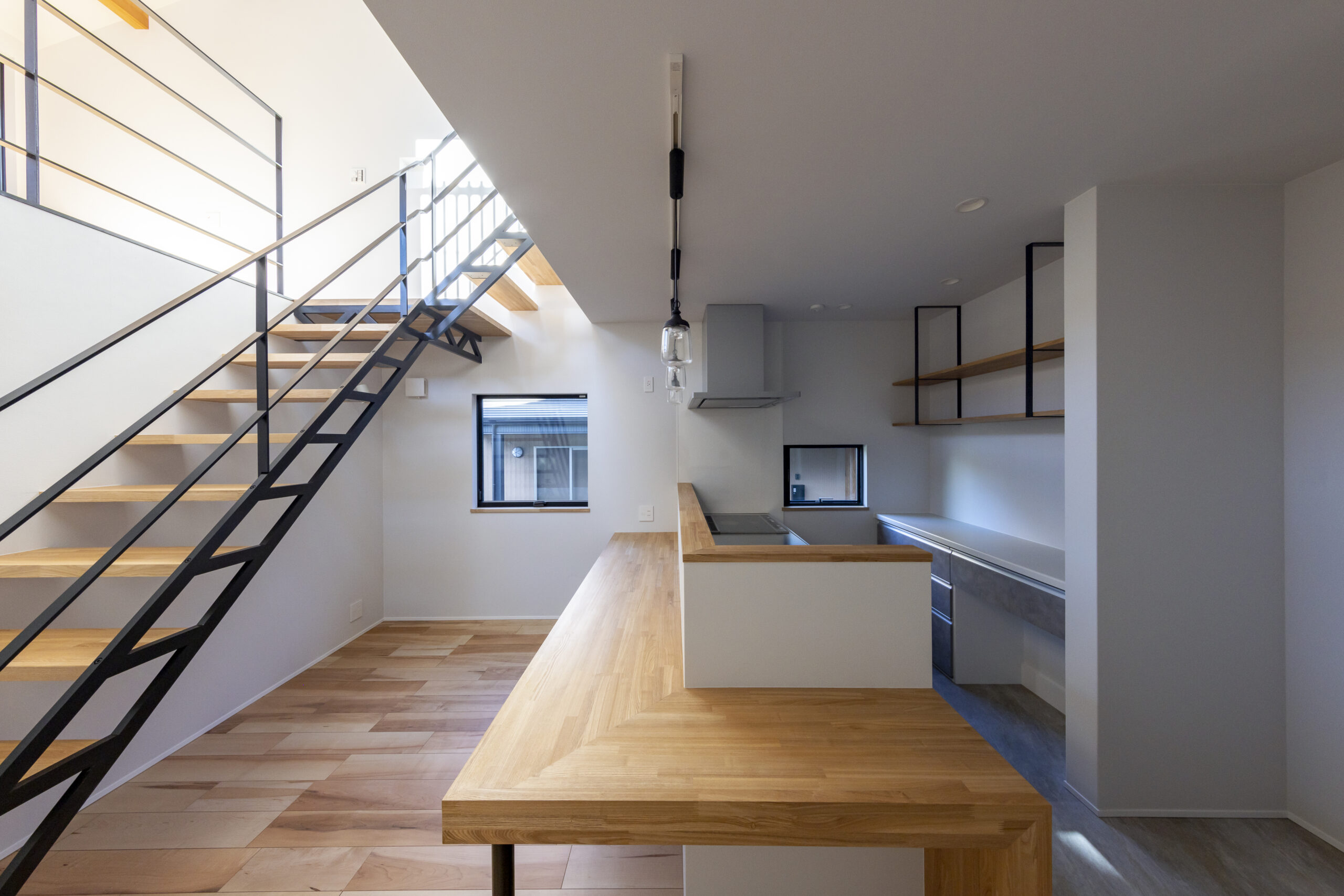 スチール階段やペンダント照明など、モダンな要素が軽やかに調和しています。
