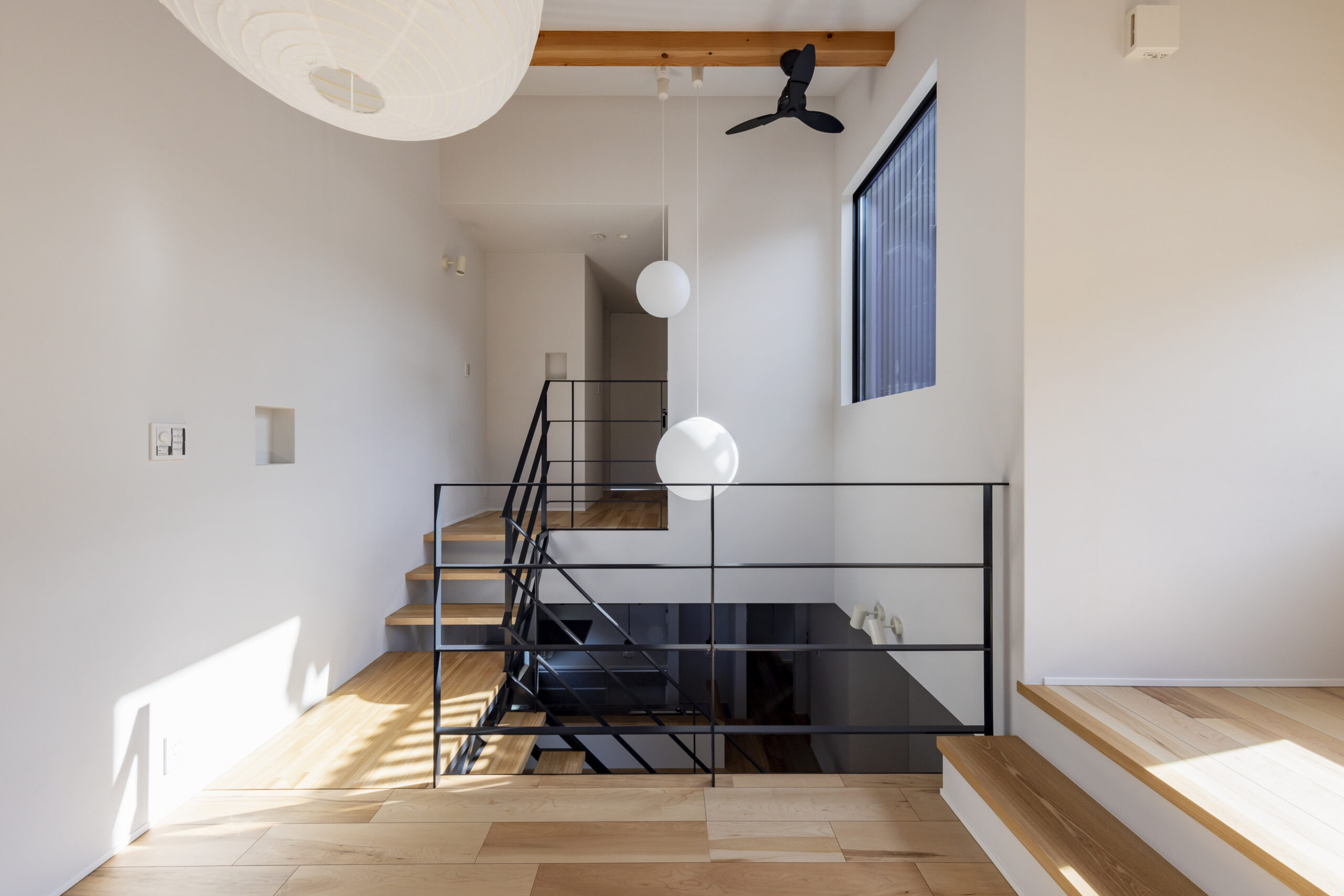 吹き抜けを中心に、階層のつながりを感じられる開放的な空間構成。