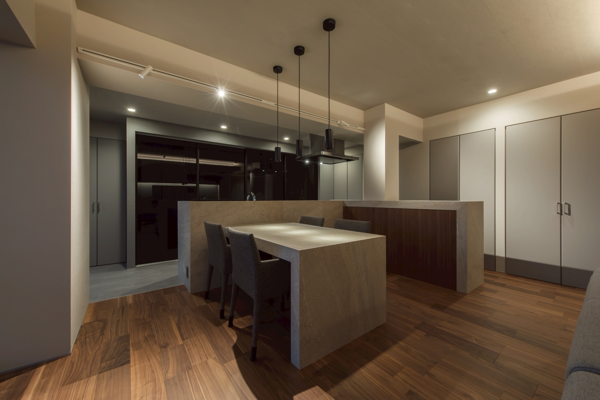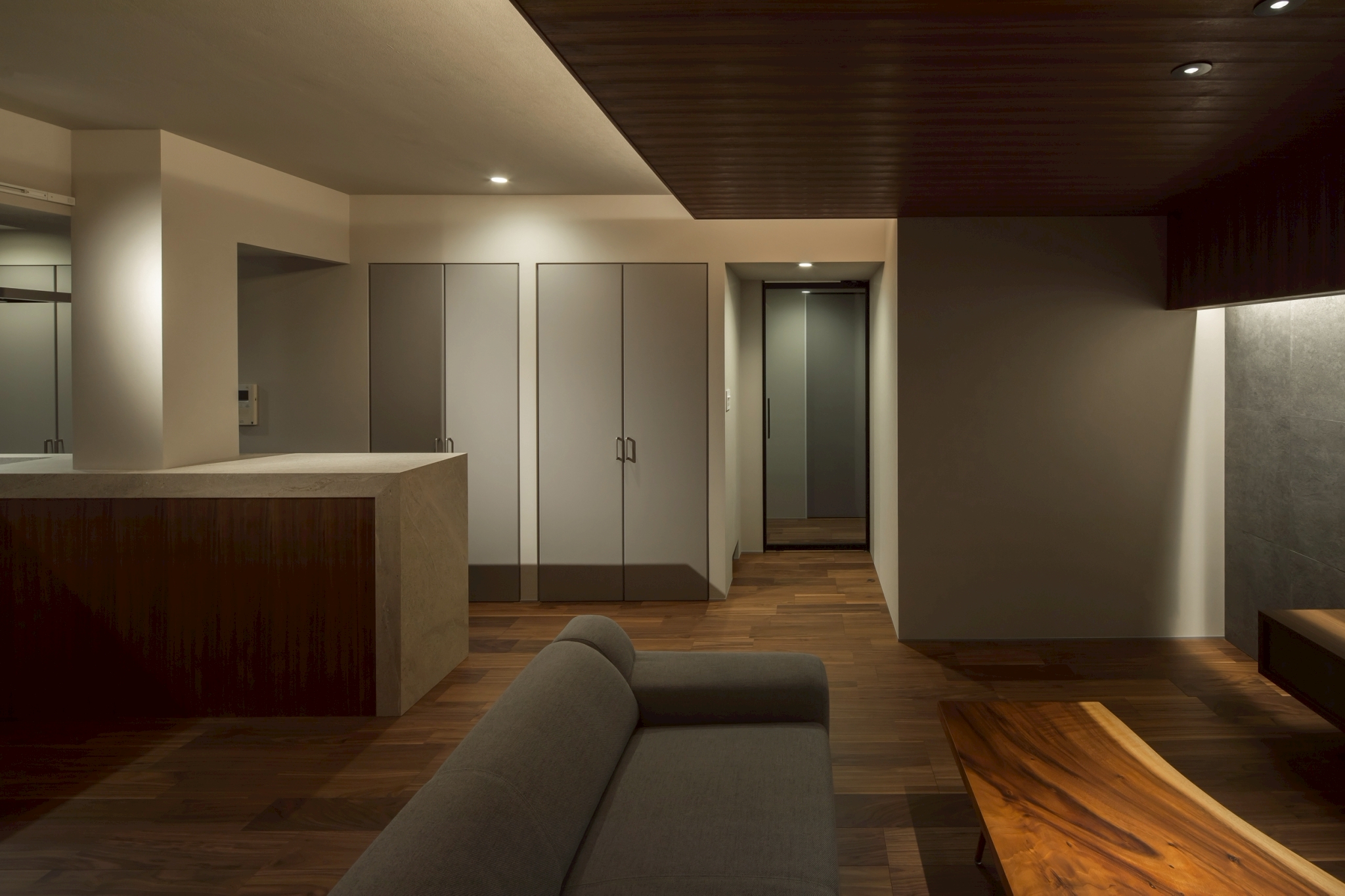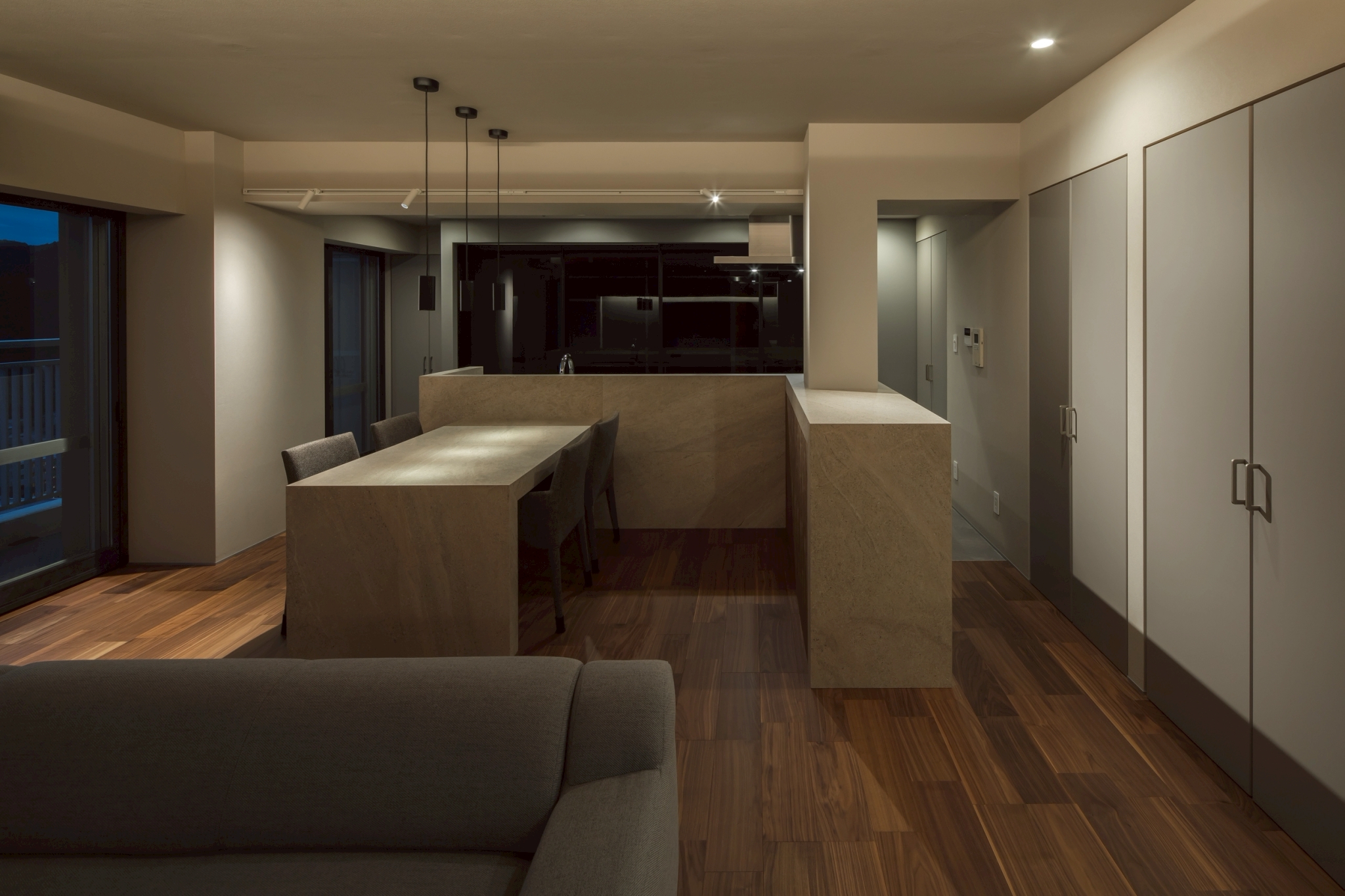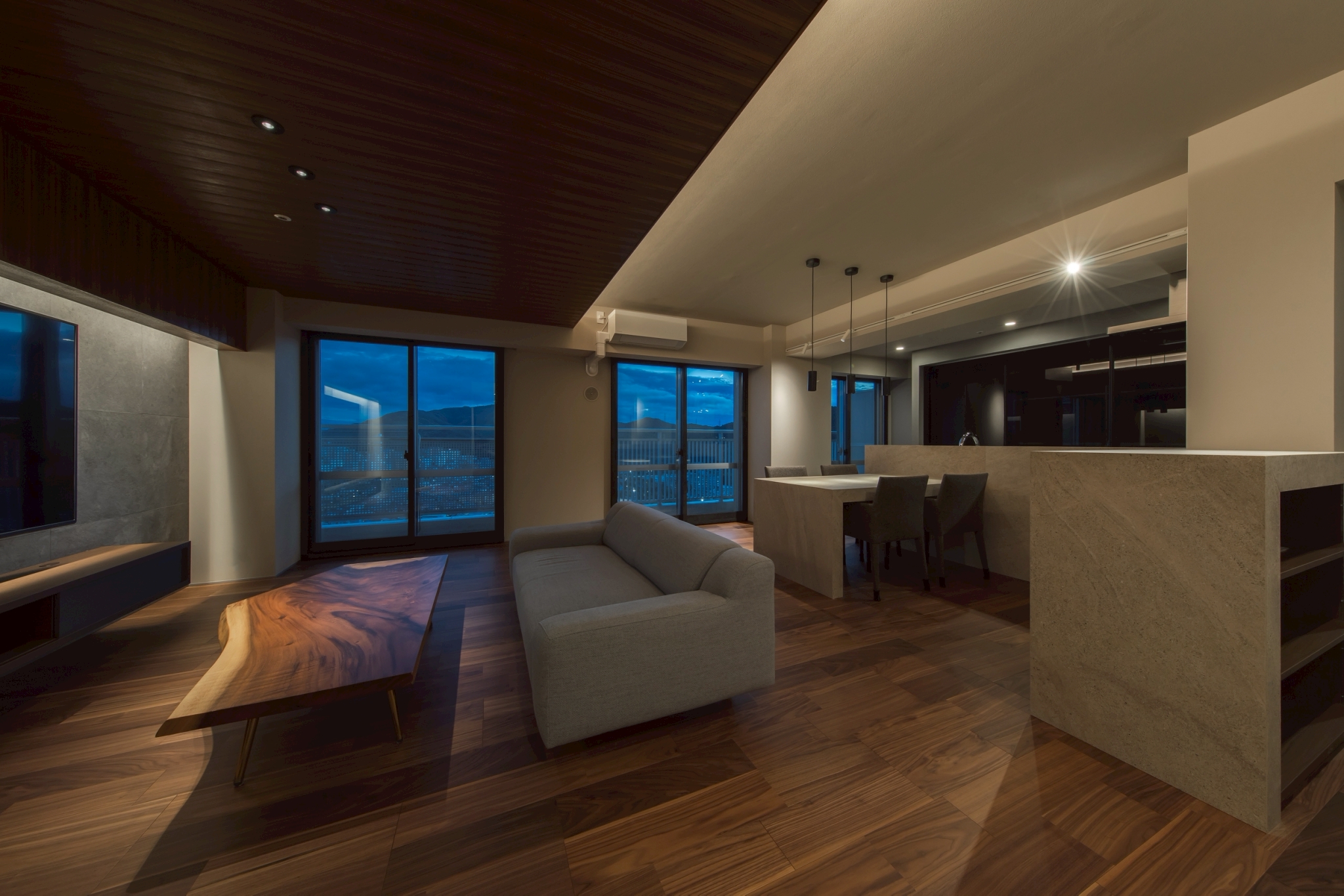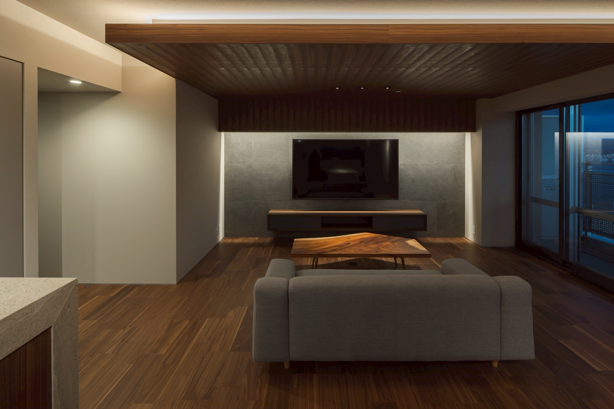 高層階の景色をやさしく取り込み、落ち着いたトーンでまとめたタワーマンションのリノベーション。 ウォールナットの温かみと造作タイルの質感が調和し、素材そのものの美しさを感じられる穏やかな住空間に仕上げました。 ミニマルな造形と柔らかな光が生み出す陰影が、日常に“ゆったりとした余白”をもたらします。 設計:伊串建築設計事務所