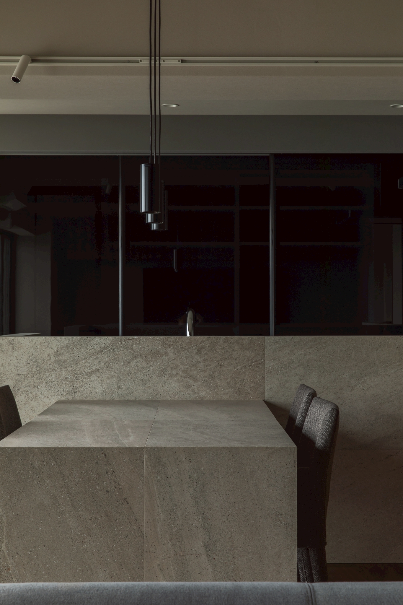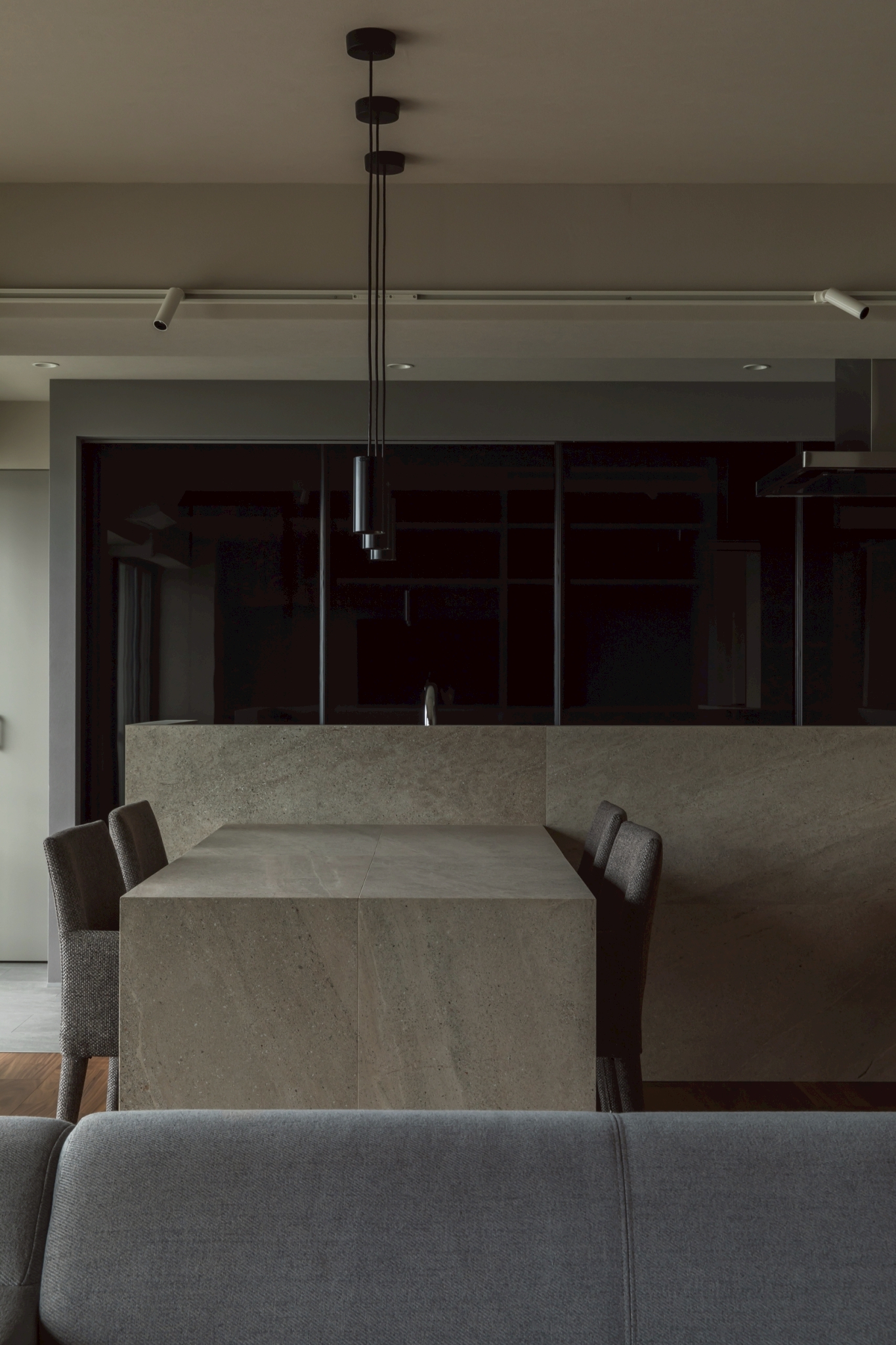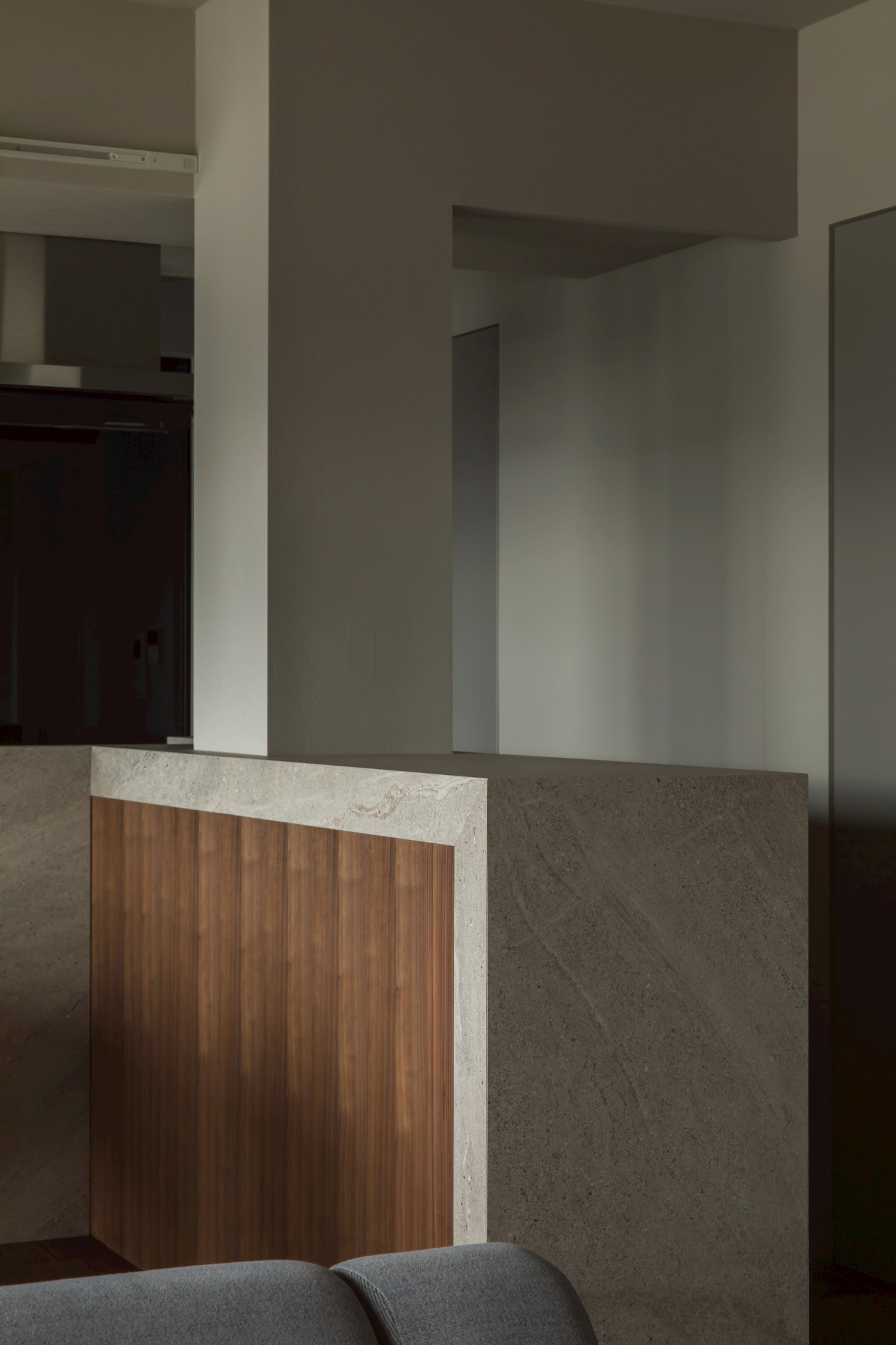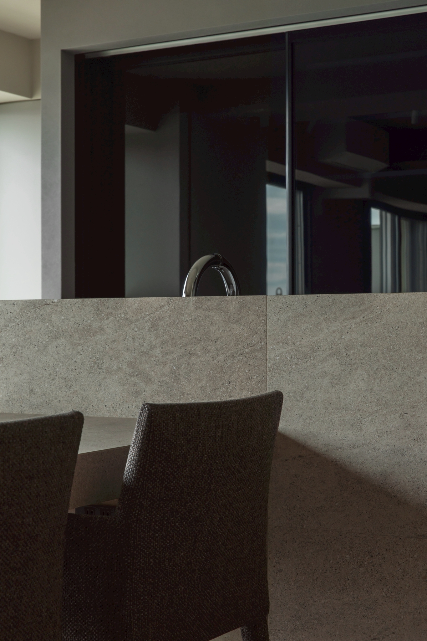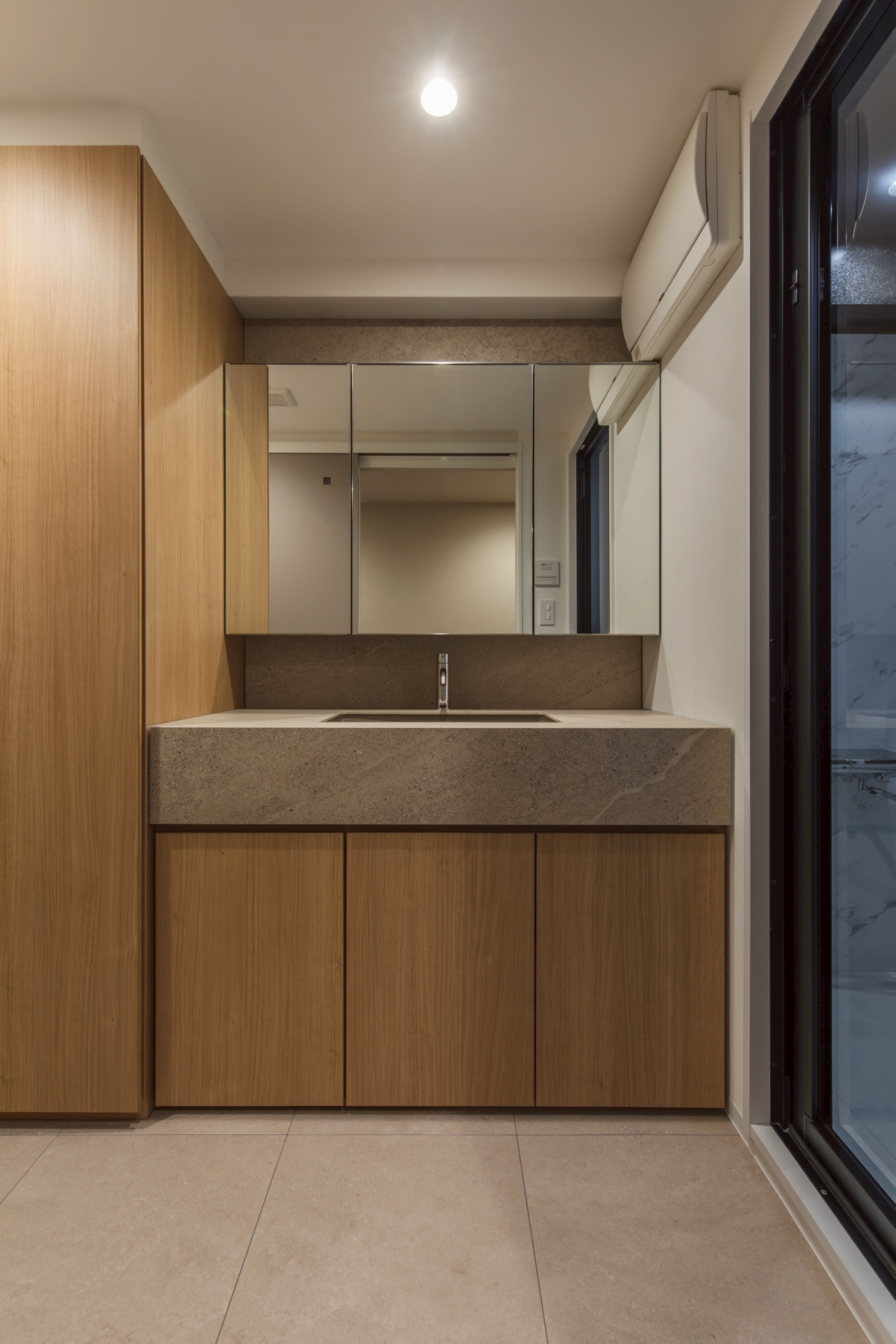高層階の景色をやさしく取り込み、落ち着いたトーンでまとめたタワーマンションのリノベーション。 ウォールナットの温かみと造作タイルの質感が調和し、素材そのものの美しさを感じられる穏やかな住空間に仕上げました。 ミニマルな造形と柔らかな光が生み出す陰影が、日常に“ゆったりとした余白”をもたらします。 設計:伊串建築設計事務所
